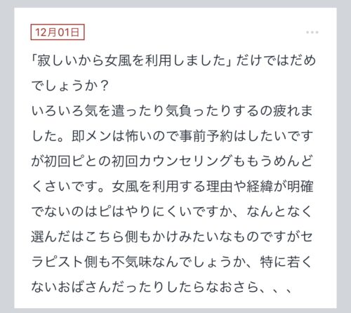 【「寂しいから女風を利用しました」だけではだめでしょうか?】