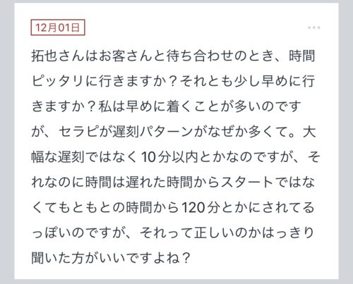 こんばんは〜!!拓也まんです! "拓也まんの!女風お悩み相談日記"のお時間です〜 kaikanセラピストランキング全国1位、セラピスト歴3年とそれなりにこの業界に携わらせて頂いてる拓…