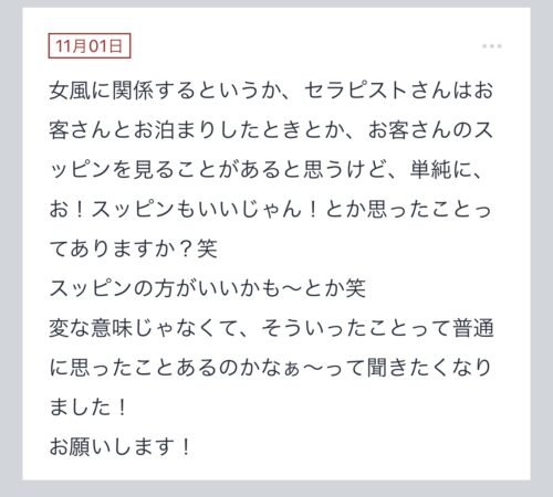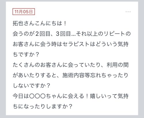 【会うのが2回目、3回目…それ以上のリピートのお客さんに会う時はセラピストはどういう気持ちですか?】