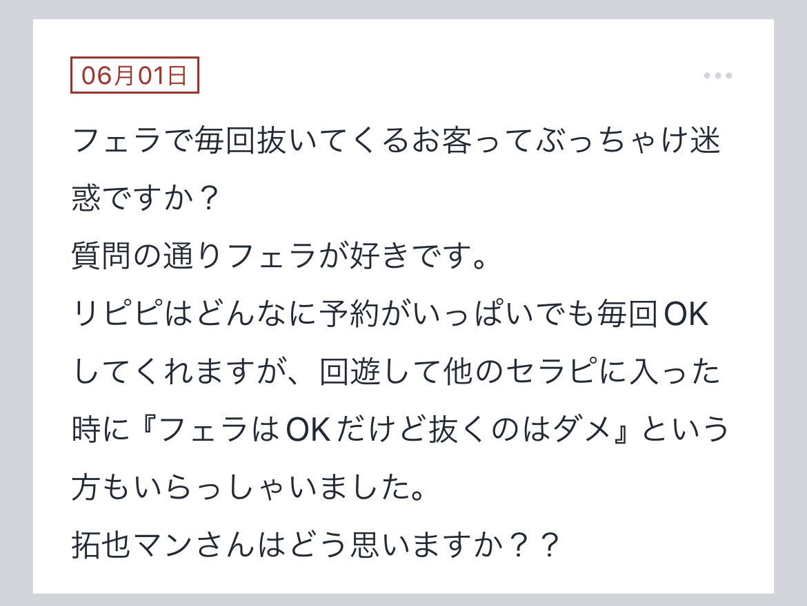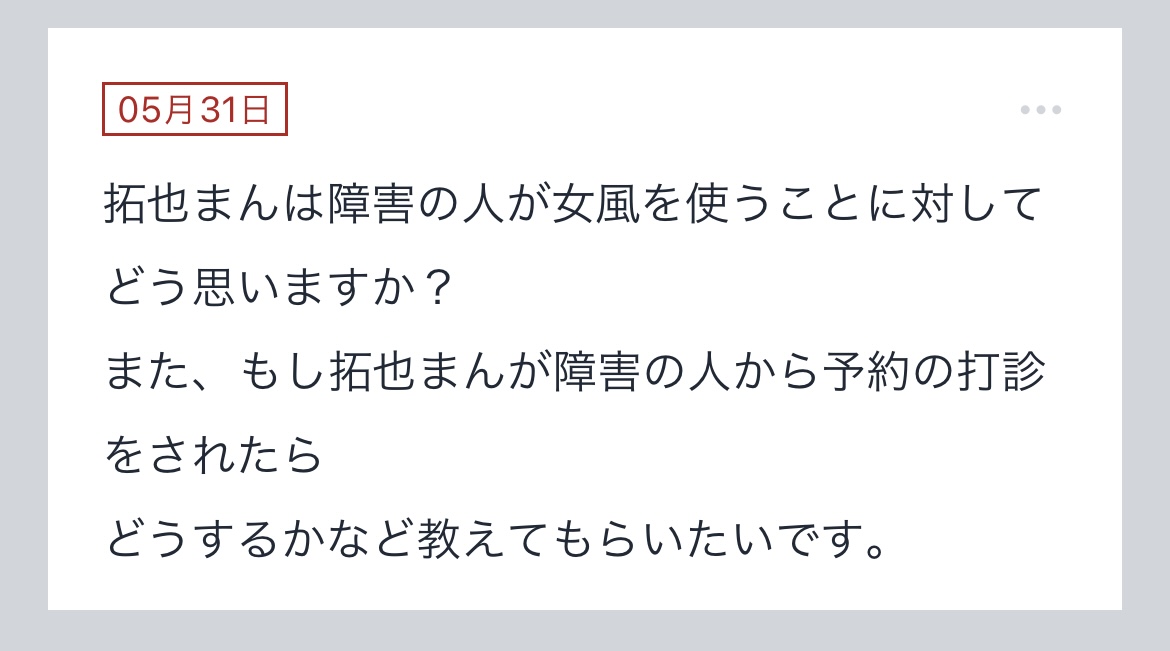 こんにちは〜!!拓也まんです!"拓也まんの!女風お悩み相談日記"のお時間です〜kaikanセラピストランキング全国1位、セラピスト歴3年とそれなりにこの業界に携わらせて頂いてる拓也まんがユーザーさんか…