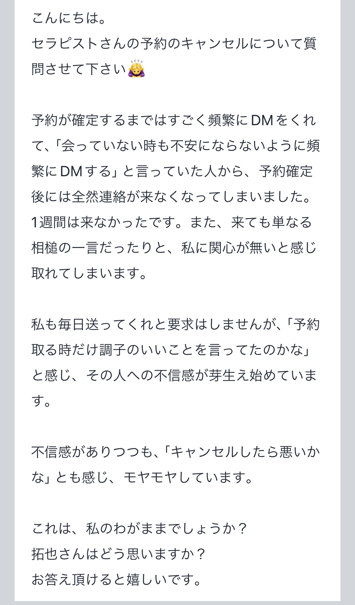 【予約確定後のやりとりが少ないからキャンセルはわがままですか?】