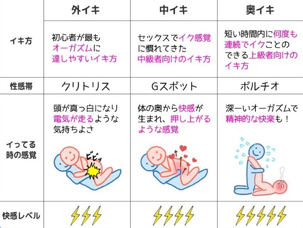【イキ方の違い】 こちらの表が分かりやすくて 参考になります◇ ⚫︎外イキとGスポットイキは、 賢者モードに入ります。 (沈静化ホルモンが分泌の為) ↓ 部位が気持ち良い◇ ⚫︎ポルチオイキは無限に…