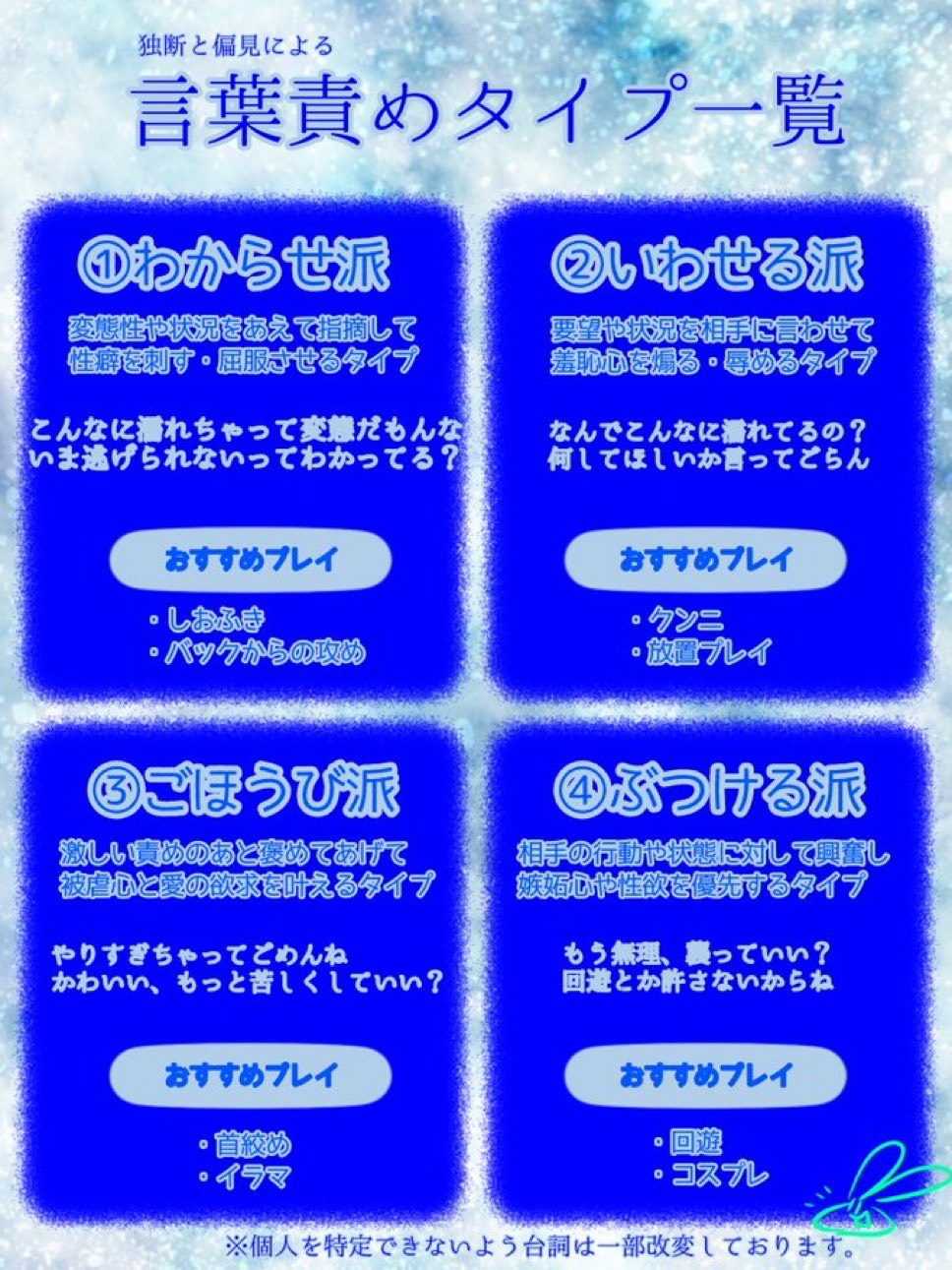 【言葉責め】 この使い方で責め手の タイプと性癖が読めます。。笑 ちはみに僕は相手で使い分けるんですが、 基本的にはここの中にありません。 ↓ 相手の集中、興奮、快楽を 引き出す事に注力する為に増幅や…