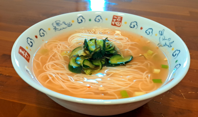 かわった素麺シリーズ。 鶏ガラスープを濃いめに作ってとりミンチいれてスープにします。丼に潰した梅干しと氷を入れたところにスープを入れて冷し汁になったところに茹でて冷水洗いの素麺。仕上げに塩揉みキュウリ、ミョウガ、生姜、ネギ。夏向きのお味でサッパリ食べれます🎵
