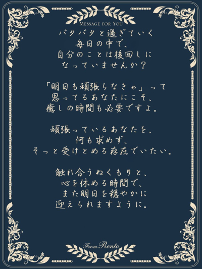 仕事終わりで、疲れた身体をリフレッシュしませんか? 緊張を解いて、素のままの君でいてほしい その先は…俺が全部受け止めるから 今日は18時から出勤しています! …