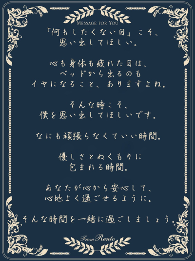 2025-10-12初対面って、少し緊張しますよね。 でも心配いりません。僕は、相手の呼吸のリズムを見てから動くタイプです。 手を添える瞬間、指先の温度が同じくらいになったら、そこがスタートライン。 肩…