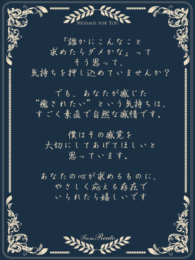 はじめまして。 このたび、名古屋にも登録させていただきました恭介です。 年齢を重ねたからこそできる「寄り添い」と「安心感」を大切にしながら、これまで多くの女性の心と身体に触れさせていただいてき…