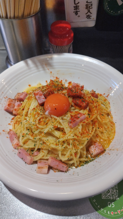 ってことで、以前TVでみたペペロンチーノ専門店が気になっていました! 今回注文したのはベーコン+卵黄 初めてなのでベタな注文を・・・w 他にも魚介や野菜など色々なトッピングがありまし…