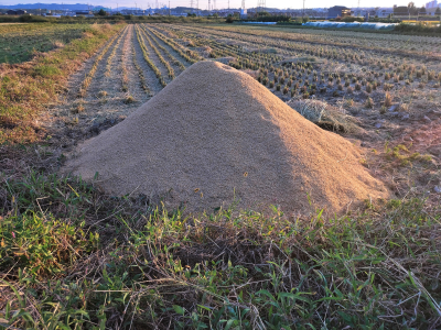 ジョギング中 珍しい風景を見た👀 稲の稲架掛け(はさかけ)と 籾殻の山 この山は …