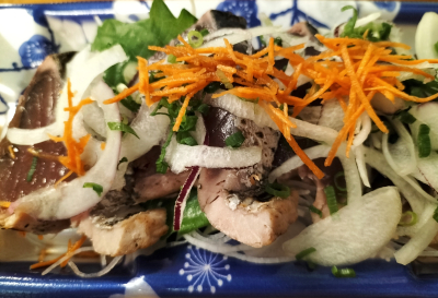 もどり鰹の美味しい季節 一度も冷凍されてない 新鮮な生の鰹を 藁焼きにすると 普通のタタキとは …