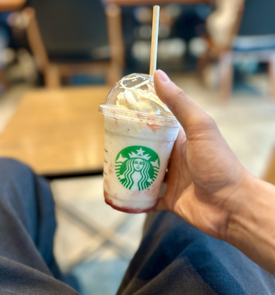 今日なんかスタバ人多いなーって日は大体新作発売の日✨ あまりにもイチゴが気になりすぎて、いつもコーヒーやけどたまには自分へのご褒美で頼んじゃった🍓 写真見て思ったんやけど、なんか最近俺…