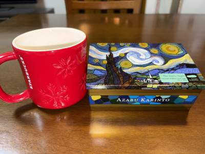 「麻布かりんと」をいただきました。 ・レーズンかりんと ・渦巻きかりんと(紫いも•金平糖) ・かぼちゃかりんと どれもとっても美味しゅうございました^_^ ゴッホの『星月…