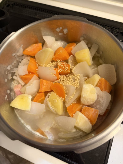 こんにちは!🌪️風羽🪶です 今日は 圧力鍋シリーズ第5弾。 無水カレー、肉じゃが、金目鯛の煮付け、煮込みハンバーグに続いて…… ついに クリームシチューに挑戦してみました🍲…