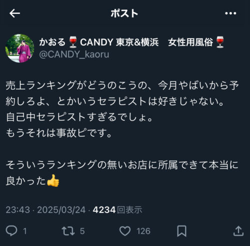 売上ランキングがどうのこうの、今月やばいから予約しろよ、とかいうセラピストは好きじゃない。 自己中セラピストすぎるでしょ。 もうそれは事故ピです。 そういうランキングの無いお店に所属でき…