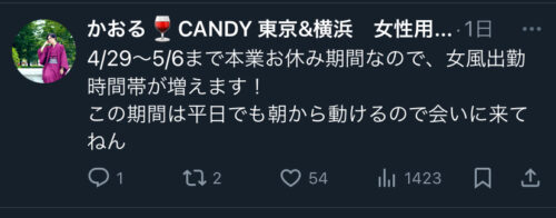 4/29〜5/6まで本業お休み期間なので、女風出勤時間帯が増えます! この期間は平日でも朝から動けるので会いに来てねん さあさあいよいよゴールデンウイークです! 時間の融通がききまくりですよ…