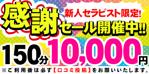萬天レディースの皆様&ご新規の皆様へ大好評企画につき、こちらのイベントは無期限の延長が決定いたしましたぁ~♪♪♪と~ってもお得なイベントとなっておりますので、未来のトップセラピストさんを発掘してみてくださ~い(^^♪なんと、なんとぉ~、NEWが付いている新人セラピストさんは150分10,000円で遊べちゃいますぅ~(^^)/120分じゃないですよ!150分です!回数制限もございませんので、何度でもご利用が可能となっております!対象セラピストは当店HPでご確認下さい!!https://mantendo-oomiya.com/event.php皆さんの新人マークが外れてしまう前に!!お早目のご予約をオススメしております(^^)/この機会をお見逃しなく♪それでは、皆さまのご予約心よりお待ちしております~!注意事項※ご利用の際はWeb予約フォームに必要事項を全てご記入の上、ご要望欄に「150分感謝セール希望」と必ずお書き添えください。また、ご利用後は口コミのご投稿を必ずお願いいたします。※イベントコースにつき、キャンセルは発生した時点でキャンセル料金を3,000円頂戴いたします。無いとは思いますが、セラピストさんと会ってからのキャンセルは5,000円、連絡なしの場合は10,000円となりますので、確実なスケジュールでのご予約をお願いします。※その他割引との併用は不可となります。ご了承くださいませ。※本指名でのご利用は不可となります。また、同じセラピストを感謝セールで2回以上指名する事はできません。その場合は本指名となり、正規のコース料金プラス指名料となります。