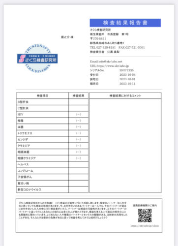 10/1に採取した性病検査は、8項目すべて陰性でした。