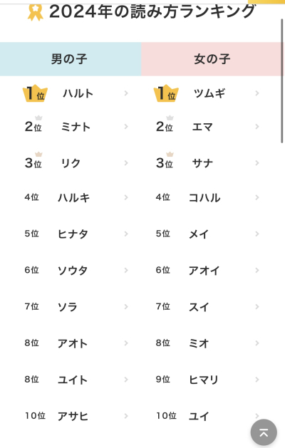 子どもの名前ランキングで
