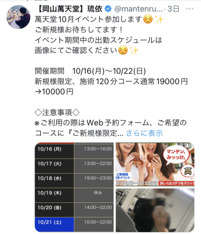 直近の出勤スケジュールは以下になります🙌✨ 10/24 14時〜22時 10/26 13時〜22時 10/27 13時〜22時 詳しい施術内容や予約方法は 岡山萬天堂ホームページ man…