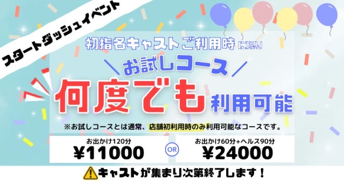 通常『当店を初めて利用する際』にしか選べないお試しコースが⋯ スタートダッシュイベント期間中は『初指名のキャストであれば』何回でもお試しコース利用可能❣️ キャストの人数が充分に揃い次第終了予定‼️ この機会にぜひご利用ください✨️