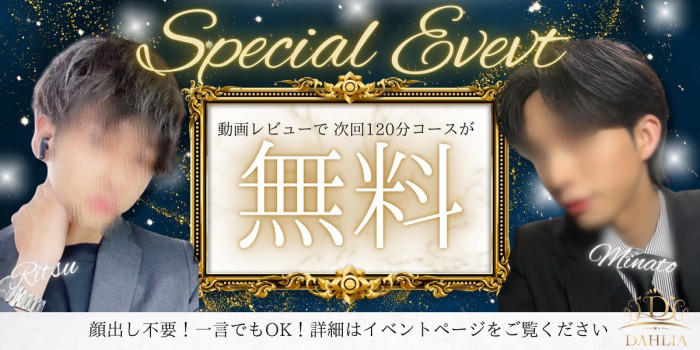 イベント開催中☆ 今回は実際に当店を利用して頂いて動画でレビュー(コメント) をしていただきますと なんと次回120分コースが無料顔出しはなし! 一言でもOK! 是非この機会に体験してみませんか? 皆様のご利用心より お待ち致しております。