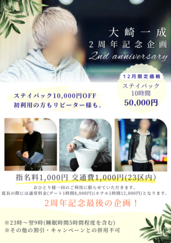 さてさてさて、 2周年記念の企画もこちらが最後になります。 事前のキャスでも多少触れましたが、泊まり系です。 ステイパックを10,000円引きで!! こちら対応できる日も多くないかもしれませんが…