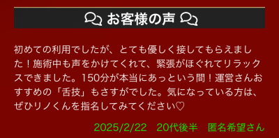 ご利用を検討している女性は口コミでリノがどんなセラピストなのか参考にしていただければと思います🙇