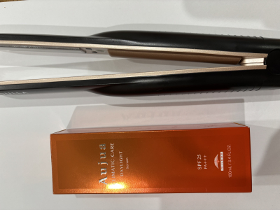 写真は、髪用の日焼け止めと、アイロンみたいなやつは超音波でトリートメント浸透させるやつです