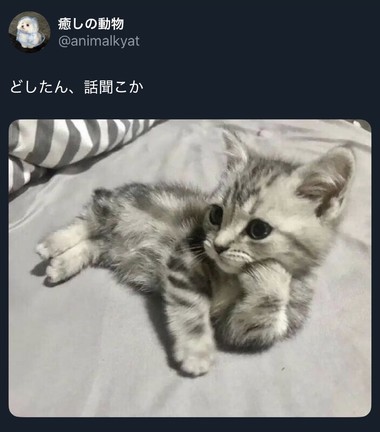 最近地味にハマってるものがありまして、というのもエックスのアカウント“癒しの動物”そう、その名の通り動物の癒しを投稿してくれるんです今回は『どしたん、話聞こか』でお送りいたします